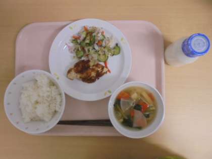 ☆10月13日(金)の給食の写真です。(ごはん 牛乳 さわらの南蛮揚げ 野菜のゆかりかけ 吉野汁)