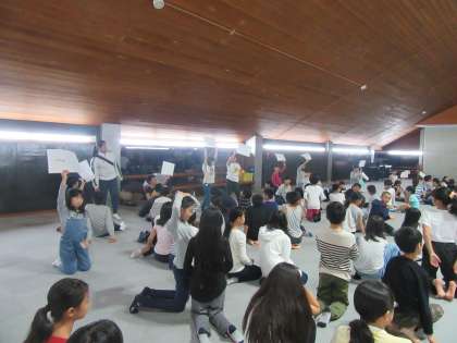 1組は、ジェスチャーゲームを考えました。お題にあったものをジェスチャーで伝えていきます。