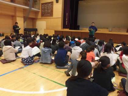 本日1時間目、体育館に集まり、学芸会の台本『オズの魔法使い』を学年で読み合わせと、オーディションで披露してもらうセリフについての説明を行いました。