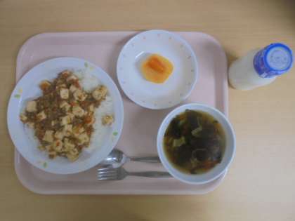 ☆10月23日(月)の給食の写真です。(マーボー豆腐丼 牛乳 わかめスープ 柿)