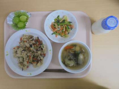 ☆10月30日(月)の給食の写真です。(五目ごはん 牛乳 タイピーエン 野菜のごまだれかけ ぶどう)