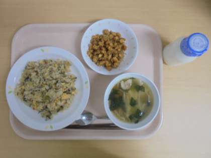 ☆11月8日(水)の給食の写真です。(高菜のチャーハン 牛乳 ワンタンスープ 大豆とじゃこの甘辛揚げ)