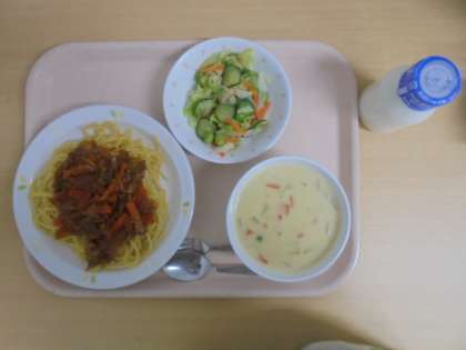 ☆11月9日(木)の給食の写真です。(スパゲッティナポリタン 牛乳 コーンチャウダー 枝豆サラダ)