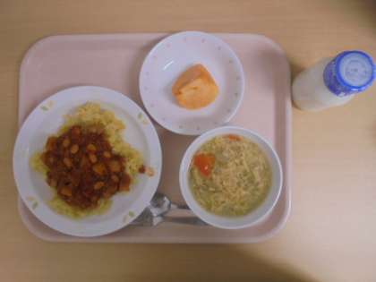 ☆11月13日(月)の給食の写真です。(チリビーンズライス 牛乳 卵スープ 柿)