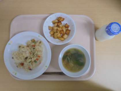 ☆11月17日(金)の給食の写真です、(中華おこわ 牛乳 とうふのとろみスープ スパイシーポテト)
