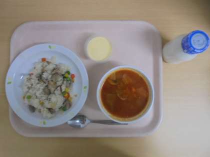☆11月24日(金)の給食の写真です。(鶏ごぼうピラフ 牛乳 ミネストローネ プリン)
