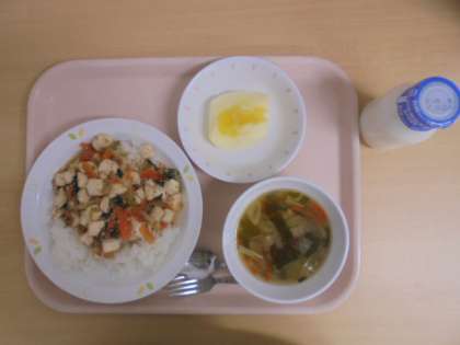 ☆11月27日(月)の給食の写真です。(シーホー豆腐丼 牛乳 中華スープ りんご)
