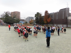 校庭では、リズムに合わせて運動をしました。