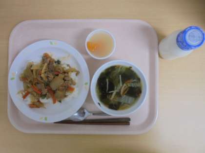 ☆12月4日(月)の給食の写真です。(スタミナ丼 牛乳 わかめスープ フルーツゼリー)