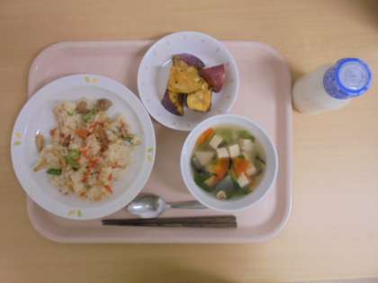 ☆12月5日(火)の給食の写真です。(こぎつねごはん 牛乳 こづゆ 大学いも)