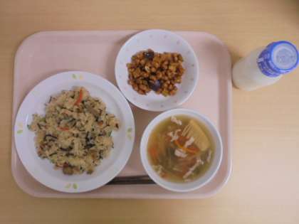 ☆12月11日(月)の給食の写真です。(五目ごはん 牛乳 沢煮椀 大豆とさつまいもの甘辛揚げ)