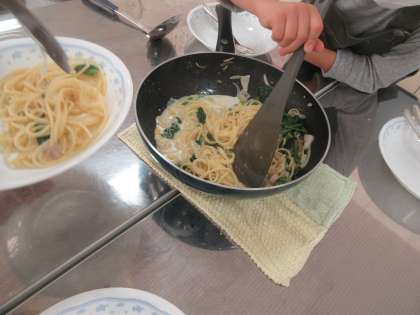5年1組と3組の調理実習でクリームスパゲティーを作りました。