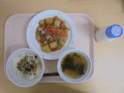☆12月18日(月)の給食の写真です。(ごはん 牛乳 手作りふりかけ 肉じゃが すまし汁)