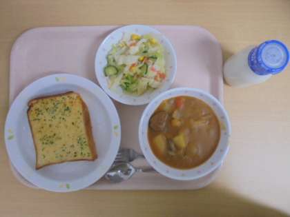 ☆12月19日(火)の給食の写真です。(ガーリックトースト 牛乳 ポークシチュー フレンチサラダ)
