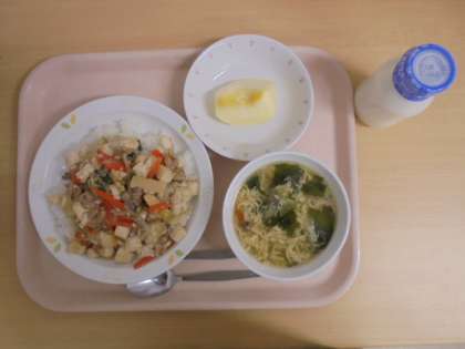 ☆12月20日(水)の給食の写真です。(家常豆腐丼 牛乳 わかたまスープ りんご)
