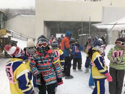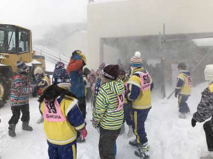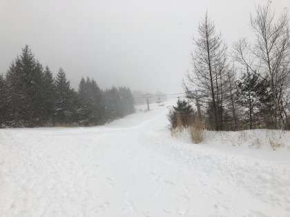 いよいよ二日目のスキーです。先程は、10センチ程度ではないかと積雪量を書きましたが、とんでもない。20センチは積もっています。吹き溜まりなどは4〜50センチはあるところもあります。風も強く雪も途切れることなく降り続いています。これから出かけるところの写真です。