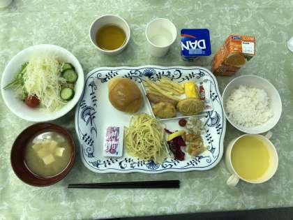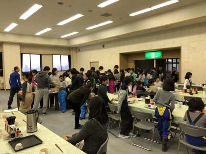 朝食の様子です。スキーの服装に着替えて朝食を食べました。