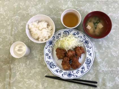 昼食です。本日の昼食のメニューは鳥の唐揚げでした。
