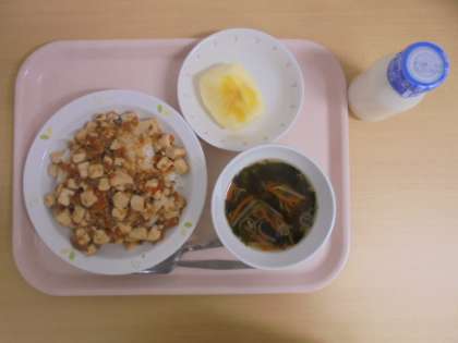 ☆1月17日(水)の給食の写真です。(マーボー豆腐丼 牛乳 わかめスープ りんご)