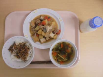 ☆1月18日(木)の給食の写真です。(ごはん 牛乳 かみかみ佃煮 五目うま煮 すまし汁)