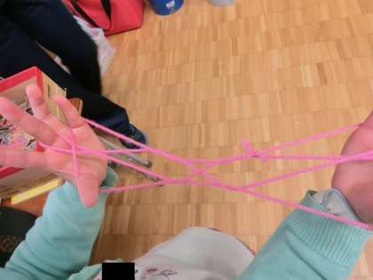 1年生の生活の授業で、むかし遊びをやっています。むかしの遊びには、ベーゴマやコマ、竹とんぼ、めんこ、カルタ、けんだま、おはじき、おてだま、あやとりなど身近にある木や布、ヒモ、紙を使った遊びがいっぱいありました。