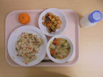 ☆1月22日(月)の給食の写真です。(かやくごはん 牛乳 野菜のみそ汁 いかとさつまいもの揚げ煮 みかん)