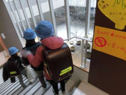 階段の近くで下級生が6年生の作品を見ながら「すごいなあ。」「上手だな。」「私たちもやってみたいなあ。」「早く6年生になりたいな。」と話をしていました。