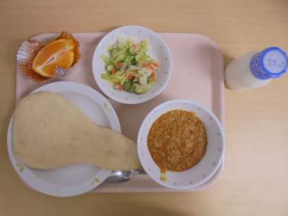 ☆2月6日(火)の給食の写真です。(ナン 牛乳 キーマカレー バジルサラダ デコポン)