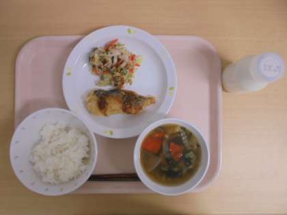 ☆2月7日(水)の給食の写真です。(ごはん 牛乳 魚の香味揚げ 野菜のゆかりかけ せんだこ汁)