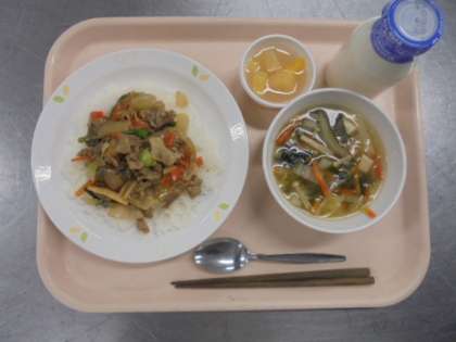 ☆2月8日(木)の給食の写真です。(スタミナ丼 牛乳 中華スープ フルーツゼリー)