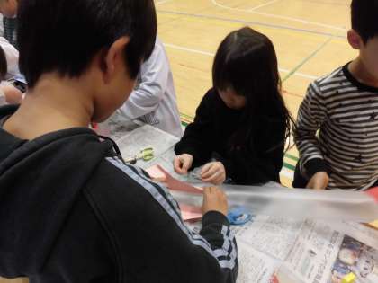 2年生と一緒に、おもちゃフェスティバルをしました。ビニールロケットや魚つり、わりばしでっぽうなど、班ごとに選んだおもちゃの作り方や遊び方を、2年生から教わりました。