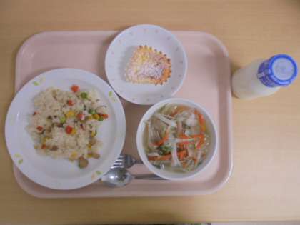 ☆2月22日(木)の給食の写真です。(三色ピラフ 牛乳 フォー・ガー チーズケーキ)