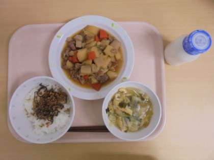 ☆3月1日(木)の給食の写真です。(ごはん 牛乳 かみかみ佃煮 肉じゃが 大根のみそ汁)