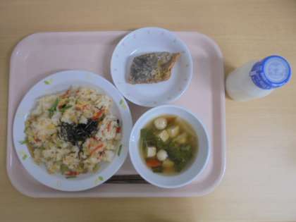 ☆3月2日(金)の給食の写真です。(ちらしずし 牛乳 すまし汁 鰆の立田揚げ)