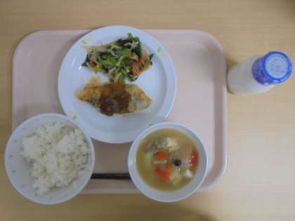 ☆3月7日(水)の給食の写真です。(ごはん 牛乳 魚のバーベキューソース おひたし 豚汁)