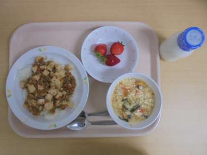 ☆3月12日(月)の給食の写真です。(マーボー豆腐丼 牛乳 サンラータン いちご)