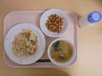 大豆とじゃこの甘辛揚げは、かみ応えがありカルシウムがとれるメニューです。子どもたちはしっかりよくかんで食べていました。