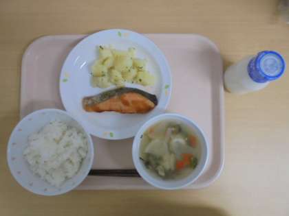 ☆3月15日(木)の給食の写真です。(ごはん 牛乳 鮭の照り焼き 粉ふきいも きりたんぽ汁)