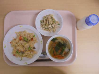 ☆4月20日(金)の給食の写真です。(チャーハン 牛乳 春雨スープ バンバンジーソテー)