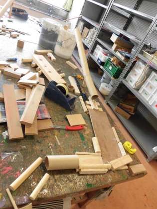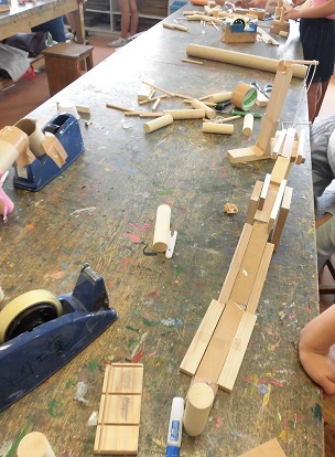 図工では、木材や段ボール芯などを使ってビー玉を転がす装置を作りました。