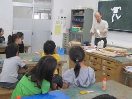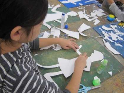 遊んでいる姿を紙版画で表しました。友達とお互いにポーズをとって、腕や足の形を確かめながら作りました。