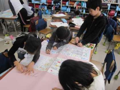 先日の町探検で見たり聞いたりしたことをグループごとに模造紙にまとめています。グループの中で分担を決め、発表原稿も作りました。これから予定されている発表会に向けて、ますます力が入っています。