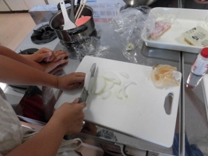 家庭科の調理実習では、川場移動教室の飯盒炊爨に向けてカレー作りをしました。