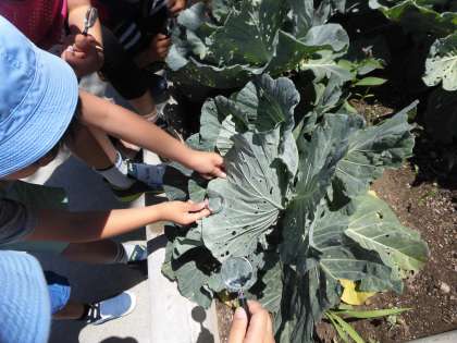 はじめのうちは、なかなか見つけることができなかった児童ですが、キャベツの葉の裏に卵があることに気が付くと、「こんなところにあった!」や「思ってたより、小さい!!」と、おどろきの声がたくさんあがりました。