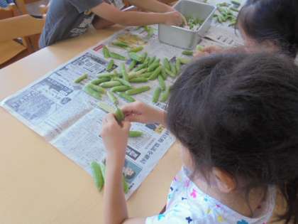 鮭ピースごはんに入っているグリンピースを2年生がさやからむいてくれました。むきたてのグリンピースはホクホクしていて甘く、苦手な子どもたちも食べていました。