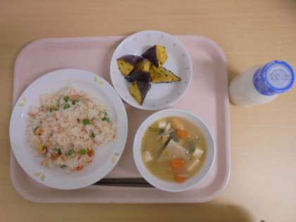 ☆6月7日(木)の給食の写真です。(鮭ピースごはん 牛乳 大根のみそ汁 大学芋)