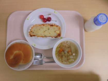 ☆6月12日(火)の給食の写真です。(ミルクパン 牛乳 コテージパイ キャベツのスープ さくらんぼ)