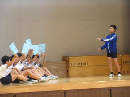 この集会では、水泳の学習にあたり、大切なルールを子どもたちが劇を通して下級生に教えてくれます。