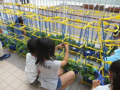 1年生のあさがおは子どもたちの「おおきくなあれ!」という声掛けに答えるように、ぐんぐんと成長しています。つるも長く伸びてきたので、支柱を立てました。
