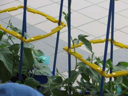 支柱のクリップ部分に挟んでおいたつるが、翌日にはくるんと巻き付いている様子を見て、「すごい!」「ふしぎ!」と驚きの声を上げていました。